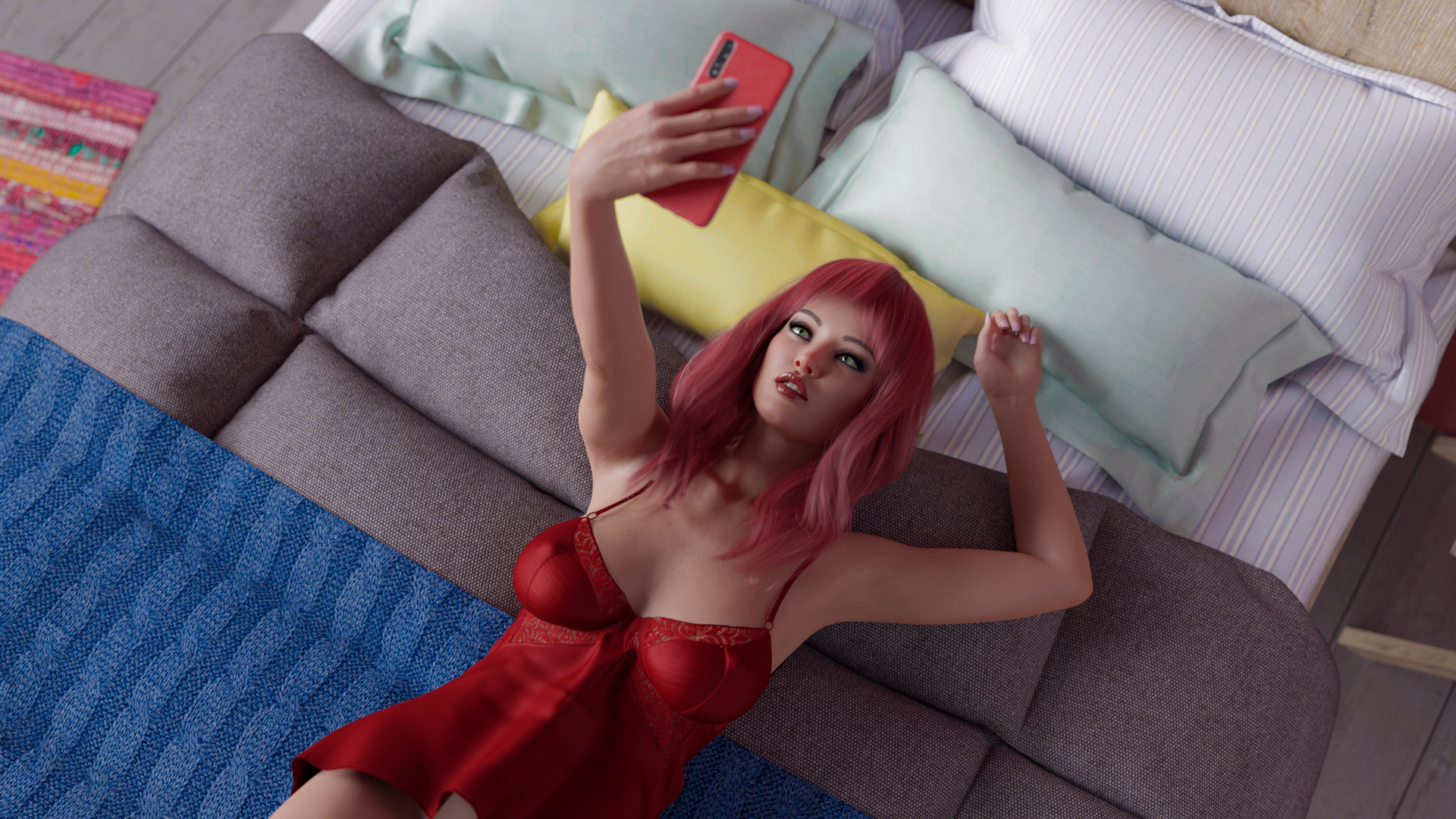 The main characters dick needs to go, it looks like a plastic dildo. You have all these hot models with detail but give the MC a generic looking dick, it's a turn off in lewd scenes. Also, it's best to have the MC kinda work to get some love interest. They all shouldn't fall at his knees.